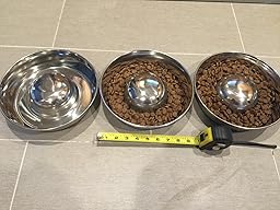 The first meal with these bowls went rather well. It took them a few moments to get used to the central buldge, and did force them to move around, where I actually did hear some chewing (which was a first in a few months). The next few meals seemed to get faster and faster, to where it may slow them down some, but after hearing the pupply belching and looking around for more food with her new and improved speed eating technique, I'm not terribly convinced I made the correct investment. I've gone back to placing a smaller bowl upside down, which still provides the greatest slowdown meathod. And yes, I've tried one and two tennis balls, small and big bowls and aside from giving them one morsel at a time, I'll stick with the upside down bowl, or I may try a muffin sheet a few clever posters have suggested.