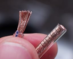 What I can't understand though is why this product page and the product packaging don't state that any aluminum is involved. The spool states, verbatim: "Conduit: High Purity, Oxygen-free Copper". This cannot be true. I cut a sample, stripped off the insulation, and scraped the strands with a knife. Sure enough, just like other CCA wire, the copper scraped off and revealed the silvery metal underneath. Amazon's product page states it is "Greater than 99.95% pure, oxygen-free copper conductors", but it seems more realistic to say that it is 99.95% aluminum and 0.05% copper (a micron-thin copper coating).