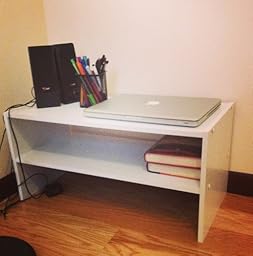 It's very small. Fits perfectly where I wanted it to fit. It holds my laptop and speakers and a few books. School hasn't started, so let's see if it can hold up my fat textbooks. Either way it works nice and does what I wanted it for. Easy to put together. Took like 15-20 minutes and that's because I'm very slow with screw drivers. The pre drilled hole do seem a bit off, but that didn't bother me that much. Material is crappy, but fine for the price. I think if I got it wet, like put a cold glass of water on it, the white laminate might start to bulge up and look nasty. But I'm only using it as a book place. And I think I will eventually buy more to stack on top of one another and place inside my closet. Worth it for $20. I'll upload a pic of it.