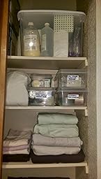 *Sterilite 19859806 30-Quart Ultra Latch Box, White Lid See-Through Base with Titanium Latches, 6-Pack (Especially great for taller items, such as bath products purchased in bulk, larger sized tall bottles, etc) These are the largest bins shown in photos, upper and lower shelves.