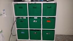 I purchased the Martha Stewart white cubical storage system from Home Dep** for $40 to go with these green storage cubes. They fit well with only about 3/4 of an inch head space in each cubical as you can see in the picture I provided on this page. The measurements of the green cubes are 10x10x10 I measured it myself so it isn't 10.5x10.5x10.5 but I'm happy. It is VERY STURDY once the insert is in. These are great bins and a great addition to my son's Mario and Luigi room. I will be adding a blue jumpsuit design to some of the green bins and I will sew two yellow buttons on to mimic Luigi's clothing. I have attached a photo of the green bins to this page.