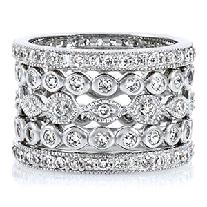 • Two rings have bezel set round cut Simulated diamonds, two rings have pave set Simulated diamonds, and one ring has pave set Simulated diamonds in round and marquise shaped beaded metal settings