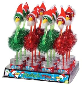 I received this pen as a gift.. from one of the coolest people ever. How could you not love Tinsel Tim??? This pen is amazing. It lights up my desk like a Griswold Family Christmas. I have received millions of compliments on Tinsel Tim as he stands loud and proud at my desk. He is so adorable and fits perfectly into his little foot stand. Nothing says Christmas like an odd ball birdie wearing a Santa Suit! Love it!!!! Tim will have a place on my desk every single Christmas!