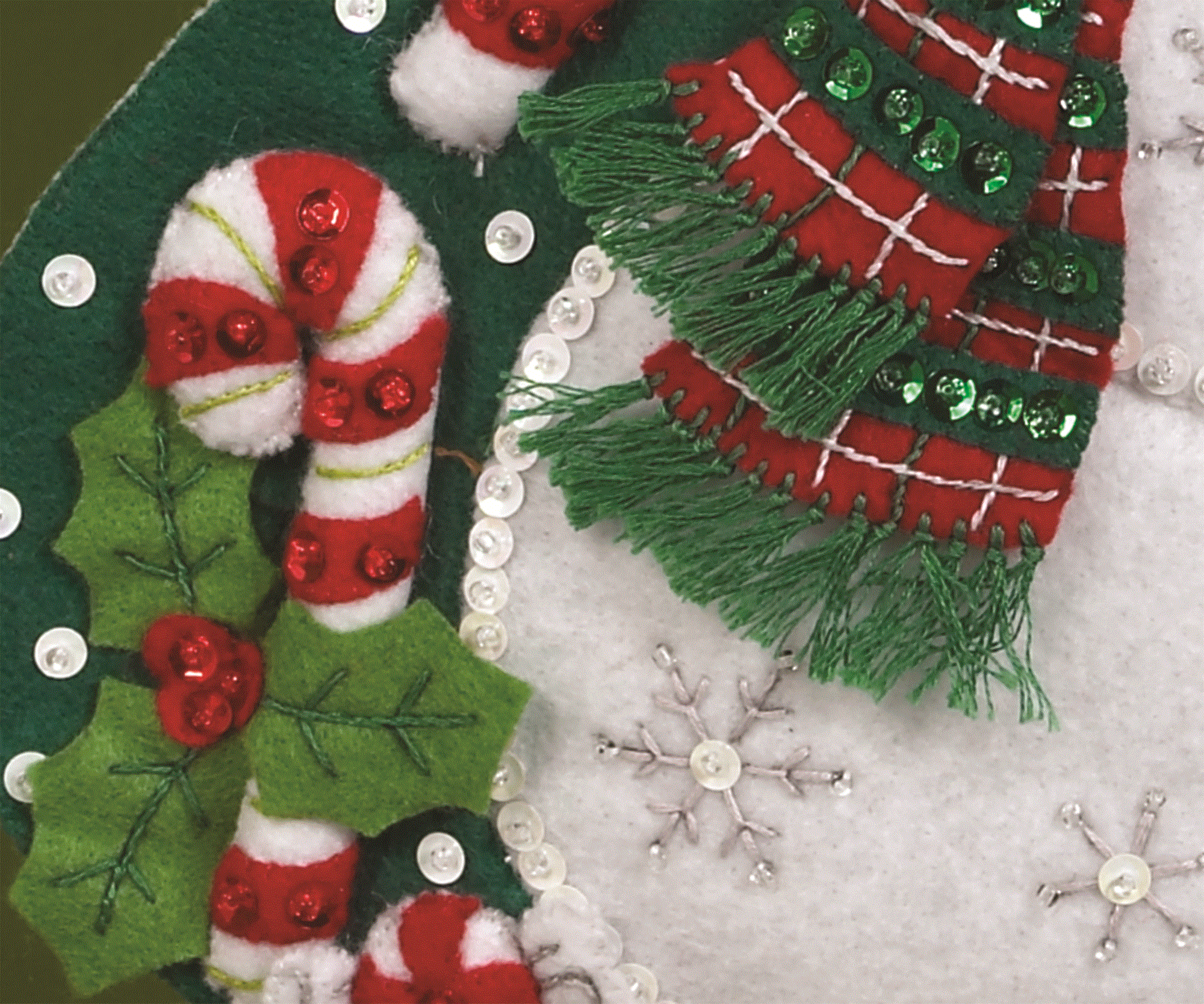 I am scoring this low because some of the felt was thin, and relatively poor quality, plus the design paint wears off very easy. I found through careful handling, I could for the most part preserve the pattern, but it wasn't near as easy as previous stockings. Plus there are areas that were to be sewn last in which the paint was nearly all gone by the time I got to that section. Thank goodness for the picture to keep me on track. I also noticed that the candy cane stripe at the top is sequined on half of the red stripes, but sequins are not called for closer to the holly. I fortunately had enough thread and sequins to add my own so the stripe looked even.