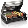 • Brushed stainless-steel housing; sturdy panini-style handle; floating cover to adjust to thickness of food