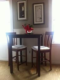 This table is just perfect for our needs. It is a nice solid table (a pleasant surprise) and the height is exactly what we wanted. It fits nicely into our rather small kitchen/dining area to use for breakfast, snacks, drinks etc. The color (a dark,reddish brown)goes well with our decor. My only complaint was the extremely poor shipping/handling. It was expensive and the table was poorly packed in the box which we went to pick up at the UPS office. It was raining and the box got completely soaked and disintegrated so that the wood was exposed. The UPS employer dragged the box across the floor, which destroyed the box more and left a small chip on the side of the table. We decided that it was not worth returning so put the damaged side of the table against a wall. I would hope that all products in the future, regardless of price, would be packed more carefully to ensure that the product arrives dry and undamaged.