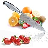 • Hand-hammered finish reduces drag when cutting, keeping foods from sticking to the knife blade; Premium pakkawood handle nestles comfortably into the curves of the palm and allows for a variety of comfortable and secure grips