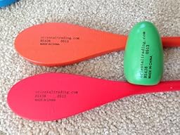 As others have said, this is a nice set, but better if used on carpeting or outside because it is wood. The spoons remind me of wooden cooking spoons, but are painted. The painting is nice, but look cheap with the Oriental Trading Company name quite large on each item. They should have marked their name on the bottom of the egg and not the side. I can see where you might want to paint over it with outdoor spray paint.