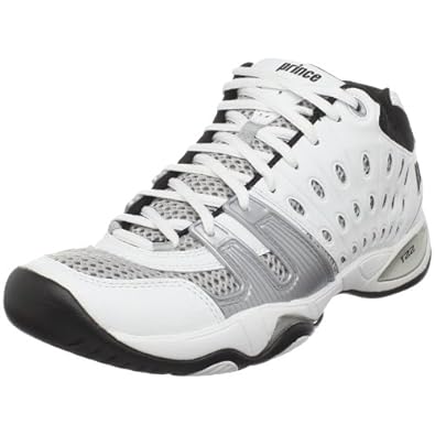 Prince T22 Mens Tennis Shoes White BlackProfile This aggressive evolution of the classic Prince T10 delivers all the performance elements of the previous supershoe The T22 offers improved ventilation and provides the durability and support that have come to be expected from PrinceLightweight synthetic upper for comfort and long lasting supportAirmesh quarter vamp and tongue panels to ensure maximum ventilationTPU foot strap provides a custom fit and stabilizes the forefootRASH toe cap adds abrasion protection for toe dragPU sockliner adds cushioning and lasting supportShockEraser midsole inserts absorb the heavy impact from the heelPU forefoot insert disperses heavy shocks from the forefootThe injected wYshbone TPU shank improves overall stabilityColor WhiteBlackSilver