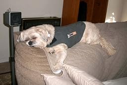Now the amazing part. My dog, Baxter, BARKS at EVERYTHING. He also has terrible anxiety attacks, esp. separation anxiety. I first put the shirt on Baxter last night. I hid some food under it first and let him find it, and then put the shirt on him. No balking at all (unusual for Bax). My husband was cleaning the ceiling fan before our twice-a-year switch of air direction and some dust from the tops of the blades fell to the floor, so he got out the vacuum. Normally Baxter freaks out at the vacuum cleaner. Barks, whines, runs into the bedroom and hides under the bed, go batty if the vacuum comes into the same room as him etc. Last night, he just laid on his "throne" and didn't even move (we have an ottoman covered with an old tablecloth that is his preferred resting place). I took a picture and am going to try to put it on this site.