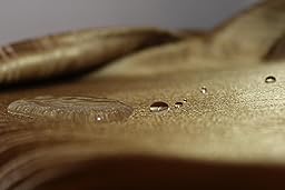 I really liked this tablecloth. In the pictures I have attached you can see how the water beads on it (I poured water on it just to see if it worked). The color and texture is beautiful. Also, we ate a Thanksgiving meal on it and none of the stains remained. The only reason I gave it a 4 out of 5 was because when it arrived I washed and dried it (the wrinkles came out for me, I didn't have to iron it!) and the tablecloth acquired a little fuzz on some spots (that doesn't normally happen with our washer/dryer). I was able to trim it off with scissors, though. Other than that, I loved the tablecloth. It looked elegant for our Thanksgiving meal, felt well made, and matched gold, brown and earth tone hues decor I was using! I washed it and dried it after using it and no fuzz appeared this time.