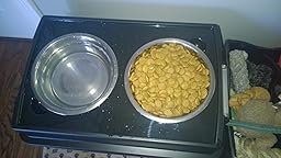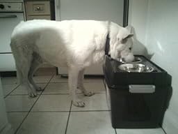 Really pleased with this elevated feeder, no more clunky bag of dog food sitting in the kitchen. Always buy 35 pound bags because they are cheaper, too big for the pantry and I don't like running to the basement either. Thought it might be hard to get food with water in bowl but its not, just unlock, set top angled across and scoop out food.My dog has adjusted well also, she did not have an elevated feeder before. Very pleased with this product.