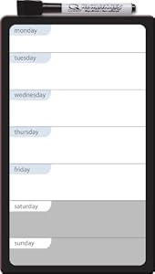 • Dry-erase surface is divided into seven sections with pre-printed days of the week; frameless design