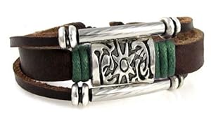 Three strand brown leather bracelet has a metal sun design medallion centerpiece, flanked by green cord wraps on each side. The two smaller leather strands have polished metal tubes and beads. This bracelet fits all wrist sizes 5.5 to 8 inches (extra small to xl). Adjustable drawstring pull cords.