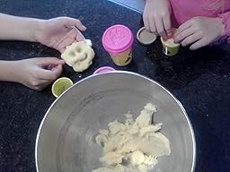 Recipe for playdough: 1 cup flour, 1/4 cup salt, 1 tablespoon cream of tartar, 1 tablespoon vegetable oil, *optional* 2 packets of flavored drink mix (unsweetened, like Koolaid, etc), and 3/4 boiling water. Mix until smooth, add a bit more flour or salt as needed (for some reason the drink mixes with red food coloring need more flour/salt) until it is easy to handle and no longer sticky.
