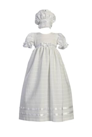 I bought this gown for my daughter's baptism and it was perfect! She looked adorable for her baptism in July on a very hot, humid day. The light cotton fabric was nice, along with soft ribbon details, heirloom quality. The bonnet fit well. Being made in the U.S. was a plus! She was about six weeks, about 10 lbs, and 23 inches and the size small worked well. Gowns I had seen in the stores were over $100, made in China, and manmade fabric. Very happy with this purchase.