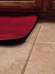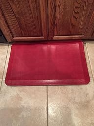 This mat was a much needed and long overdue purchase. My husband and I both get sore backs from standing on our tile floors, and this mat has worked wonders. It is also attractive and easy to clean, doesn't migrate around the kitchen, the edges stay down, and our cats don't seem driven to play with it they way they have kitchen rugs. I'm planning to get another one to put in front of the stove.