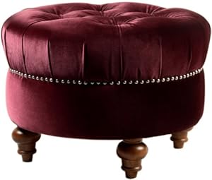 This beautiful luxurious round bench is a beautiful addition to my boudoir. It arrived exactly as pictured and is covered in a rich high-end velour, tufted with material-covered buttons and secured with hand-hammered decorative metal tacks, (the legs will need to be screwed into the bottom when you receive it. They are delicate looking, but solid wood and each attaches to the seat with a thick metal screw, very easy to do by hand). It is very solid and well built (something you worry about when you cannot actually inspect a piece of furniture before purchasing). This is elegant furniture, and is of heirloom quality. It has a romantic Victorian look to it. You will definitely have bidders fighting over it when it is time to hand it down! I usually do not spend this much on a piece of furniture I cannot inspect prior to buying, but I took a chance on this one and am glad I did. This chair was exactly what I had been searching for and I HAD to have it to complete my newly-decorated romantic bedroom retreat. I got mine about a year ago in the rich red burgundy. I alternately place it either at the foot of my bed, or in my walk-in-closet to use for seating when dressing.