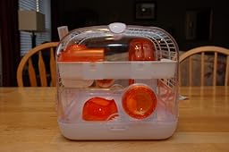 So I decided to purchase the Cristal without any previous reviews 0_o I trusted the Habitrail brand name from seeing that it has the best reviews by far in comparison so Crittertrail, JM, etc. You can't find the Cristal on Habitrail's Ovo page but it is in Hagen's (the owner of Habitrail) page and it is the newest product they have because the SKU # is the most recent. Anyway, the cage is nice to look at, easy to assemble, seems easy to clean. It comes with a quiet running wheel, a traditional water bottle instead of Habitrail's disputed Ovo water bottle, a food plate and a nice apartment type second floor. So my hammy doesn't go up the ladder very often since he also has a Ovo tower and he loves it up there. What I loved about this cage is that it is a perfect mix of plastic housing and wire caging. I use the top wires to hang toys and the bottom plastic makes it super easy to clean. Overall I LOVE this cage since it has plenty of room for him to play around and to add a couple of small toys in there for him. You should definitely consider buying an add-on den, tower, etc. since he will need a place to store his food and sleep.
