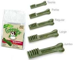 Feeding Guidelines Feed one GREENIES Canine Dental Chew per day to adult dogs. Not suitable for dogs less than 5 lbs., or dogs less than 6 months of age. Fresh drinking water should always be available. ATTENTION: As with any edible product, monitor your dog to ensure the treat is adequately chewed. Gulping any item can be harmful or even fatal to a dog. Choose the Right Size for Your Dog TEENIE Treats: 5-15 lbs./2-7 kg Petite: 15-25 lbs./7-11 kg Regular: 25-50 lbs./11-22 kg Large: 50-100 lbs./22-45 kg