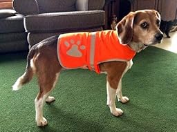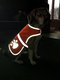 It's getting around hunting season around here in northern Michigan and we live on 20 acres that backs onto National Forest Land. My concern was that my dog, who runs on our land, might get mistaken for a bear, deer or turkey which would be horrifying! Since we have to wear "hunter orange" to comply with the DNR regulations, I felt that why not Sophie, our dog, as well? This very inexpensive, lightweight vest has nice coverage, can be seen from a far distance during the day and it glows like heck when a light flashes on it. When I let her out at night and have the porch light on, I can see her coming from a far distance! I see the reflective bands and paw prints on the vest. She also enjoys wearing it (prior to her getting this vest, she was somewhat shy and skittish, but now she is more playful and gregarious with others). I know that sounds weird, but my husband and I attribute it to the fact that the vest secures around her midsection and neck and covers her back fairly completely (kind of like a Th*nd*rSh*rt) so it may get her that "secure feeling." In any event, it does the job and we couldn't be happier that our beloved pet is safe on her romps outdoors or when I take her out on a leash! I wish I would have gotten this sooner!