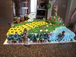 This review is a based on the use of multiple Amazon fulfilled products purchased across time. Numerous products were used to create a tinker bell themed cake, and this review touches on each of the products used. This cake was baked in the Wilton Decorative Preferred 12-by-18 Sheet Cake Pan. I used one standard cake mix in each layer. I cooked each layer using two Wilton Flower Nail Decorating Tool #7 equally spaced in the pan, and I watched for cooking time. The layers are very thin, but easily moved if you use parchment paper to line the bottom of the pan. I find cooking layers separately easier than using a cake splitter.