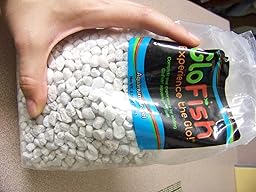 It glows under a glo fish light and looks nice. Based on the other reviews and picture and what I've seen in local fish shops, I assumed the bits of gravel in this were larger than standard gravel. The bag I received was not, just regular sized gravel. Still, it glows under a glo fish light.