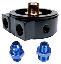 Great oil cooler adapter with threaded ports for pressure/temp monitoring. The inner thread adapter can be changed to fit different applications while reusing the main (black) adapter.