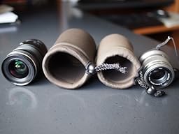 The material is a nice neoprene and the tops cinch together tightly for safe storage of your lenses. If I had one criticism it's that the different sizes (ie: medium and small) tend the be of the same girth. The heights are different but for fatter lenses or those with hoods, the fit may be a bit tight. Currently, I am using the medium pouch to store my Olympus 45mm and the small pouch to store the 20mm Panasonic/14mm Panasonic.