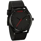 • White dial with black hands and hour markers; luminous; black ion-plated stainless steel crown with red accent