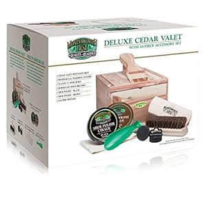 • Amazing Value! Includes: Premium natural aromatic cedar valet, 1 black shoe polish, 1 brown shoe polish, 1 polishing cloth, 1 nine inch shoe horn, 2 dauber sponges, 2 shine brushes