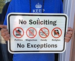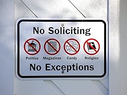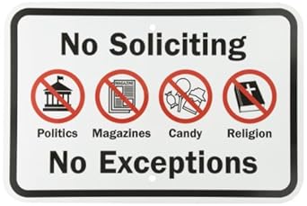 When you live in Utah you're going to get a visit from the LDS missionaries. When your neighbor brings them over and tricks you into thinking she's just stopping by, they will go right by a regular "No Soliciting" sign. In fact, that's exactly what they are told in training! This sign is explicit - no religion is right on there. It even says "no exceptions". Now I'm not sure if it will work, as this was a reactionary purchase, but it makes me feel better knowing the next time I just point to this sign and there will be no need for explanation.