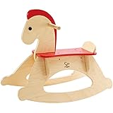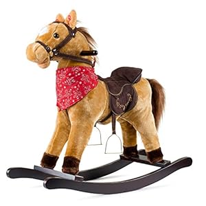 Wonderfully crafted and very detailed Rocking Horse! The bridle, saddle, reins and stirrups makes it look very realistic! The colors, soft fur, the red bandanna and the sound the horse makes are playful. A baby shower gift that he will be able to grow into and have fun with for many years to come. The saddle back goes up a bit for support, he will need to be guided carefully until he can sit upright on his own with little assistance & there are wooden bars to hold onto. Very easy to assemble, great size & I'm sure this will turn into a family heirloom, overall a great purchase! The discount offered by Amazon's "Prime" membership, the price was well below the actual value.
