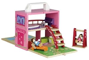 I originally saw this doll house while in San Francisco, at a department store called Gumps. I fell in love with it immediately, but knew that I would not be able to fit it in my suitcase or carry-on. When I returned home, I searched for it and I was so happy to find it on Amazon (and at a great price too)! This little doll house is simply perfect. Everything is wooden and painted in a very nice quality too! All of the little pieces fit perfectly inside also, so after pulling everything out, you can pack everything neatly away. Each side opens to reveal a house with a front yard and a back yard with a "pool". The accompanying furniture is very well-made and has so many details. Even the piano has little painted white & black keys! The dolls have bendable arms that allow them to hold on to various furniture pieces, but I think the best is bending them to sit them on the little swing. They'll actually hold on and swing!