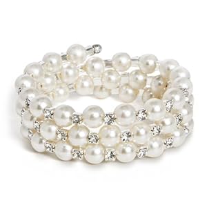 • Silvertone Rhinestone Simulated Faux Pearl Coil Bracelet