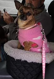 My dog and I love this car seat. My Papillon is 17 inches long and 13 pounds and the large size works great for her.she can sit up to look around and also lay down to sleep. The only thing I do not care for is the strap that hooks to her harness, she got her leg in it, it hooks to a loop in the seat.so you have basically two loops .