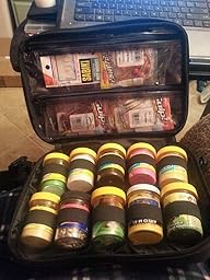 After I bought this holder, I was really excited to receive it and take it fishing. It really made a lot of space by taking all of the jars from my tackle box, and inserting them into the powerbait holder. Sometimes when I open it up, the jars are misplaced, but that's fine. The strap it comes with is very convenient for carrying the case. I give this a 5 star because overall, it is a great product.