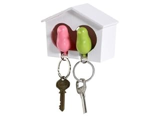 COSMOS White Birdhouse with 2 whistle Sparrow Key Ring Holder (Pink and Green)