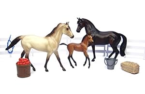 Great starter gift! This gift set is one of the best starter sets I've seen out in the Breyer World. Not only are the horses beautiful but stand well on carpet and hard wood floors while being played with. This set was given as a gift to my best friends daughter on her seventh birthday. She plays with them everyday and also took them for show and tell before school was out. The six peice fence that comes with the set and bucket of apples not only make the set complet but also is an extra surprise, I don't believe she noticed the fence or apples when she first opened up the box, she was too drawn to the horses, then she noticed them and was thrilled all over again! I would recommend this to anyone out there that is looking for a great horse gift to give. This is a great starter package. Breyer needs to make more of them!