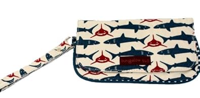 Canvas wristlet, good size and great graphics...perfect gift for my friend who likes to believe she's a shark attack survivor!