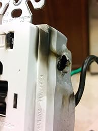 I finally found this plug nearly completely blackened with smoke stains. After shutting off the breaker and removing the device, it's obvious it melted to hell. Since the outlet was mounted to the side of a kitchen cabinet with drawers, I pulled the drawers out to get a look at the gang box, which was blackened with smoke as well. In addition, the wood around the socket and the interior ceiling of the space were black as well.