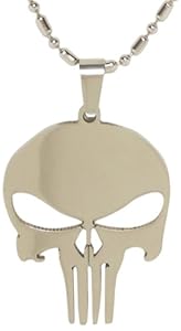 This tough stainless steel "Punisher" skull lays flat and is 1 1/2 by 1 inches. It is a very sharp and sleek looking skull. It hangs from a 24 inch beaded stainless steel chain.