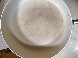 We purchased this set in May. The white nonstick surface stains fairly easily (cooking eggs, grilled cheese). However, cooking marinara sauce doesn't stain these pans which I find rather confusing. They also scratch very easy. We don't use metal utensils and we don't put them in the dishwasher but they are all scratched. I use cooking spray because they're not really nonstick. They do the job but you're definitely paying for the name, not the quality. I'm already considering buying a cheap set of pots and pans because these haven't held up like I thought they would. The cookie sheets and utensils are about the only thing that's been of good quality so far. The pictures are from the two frying pans. We use them the most but I still didn't expect the stains and wear that have occurred.