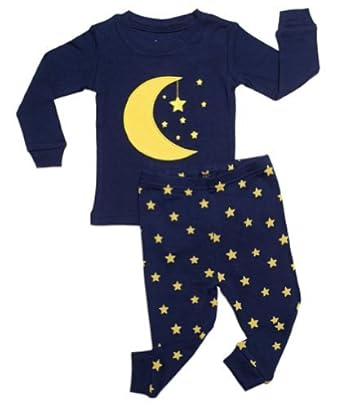 You'll love these cute and comfy PJs from Leveret! The top features a Moon and stars applique, And the bottom features a star design, Both top and bottom are made of soft cotton. For fire safety, these pajamas should fit snugly. 100% Cotton Machine Wash Warm, Inside Out Made in China These Pajamas are snugly fitted pajamas, When buying please consider that because it is snug fitting if your child is above average you should buy a size bigger
