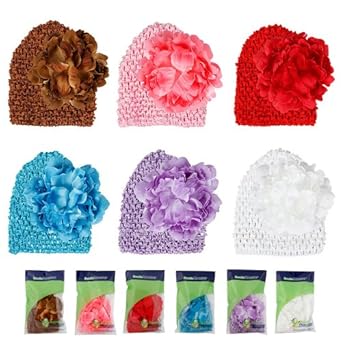 • Includes 6 crocheted beanie caps in various colors and 6 removable flower clips in various designs.