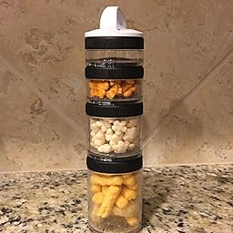 5 stars! I originally bought this item for my spouse and I to use for our vitamins, pre-workout, protein powder, etc. I loved this product so much that I purchased another for our baby's treats. It's perfect for our one year old's yogurt melts, cereal puffs, cheese crackers, and cookies...especially when we go out to restaurants. We are always asked where we purchased it. It's so much more efficient for carrying a variety of snacks, and fits nicely in the diaper bags