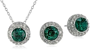 • Elegant jewelry set including coordinating studs and pendant necklace featuring faceted round centerpieces framed in halo of white Swarovski crystals