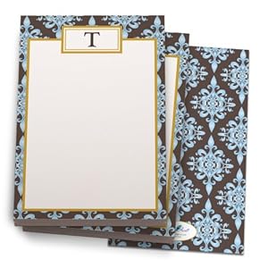 Blue and Chocolate 'Floral' Note Pad with 'T' Monogram. 24 Luxe Cover Stock Sheets per set. 2-pack.