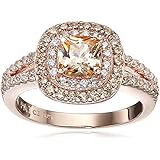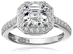 • Platinum-plated ring featuring asscher-cut cubic zirconia at center surrounded by halo of smaller stones