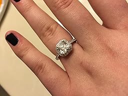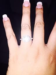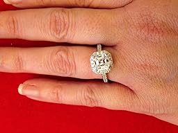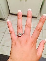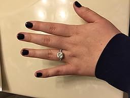 This ring is gorgeous. The SPARKLE from this cut is beautiful, so much light comes off the main stone. The halo stones are set well and while it's light, it's well-balanced, if that makes sense. And the most important thing, one would have to stare long and hard at this ring to say that it's not real. This is such a pretty, pretty ring.